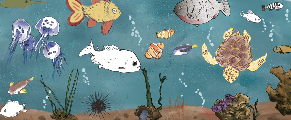 An accordion zine documenting the things AUB Zine Society saw on their trip to Bournemouth's Oceanarium in 2022! Full of drawings from various artists, explore the creatures lurking on the page, made to look like a huge fish tank when folded open!